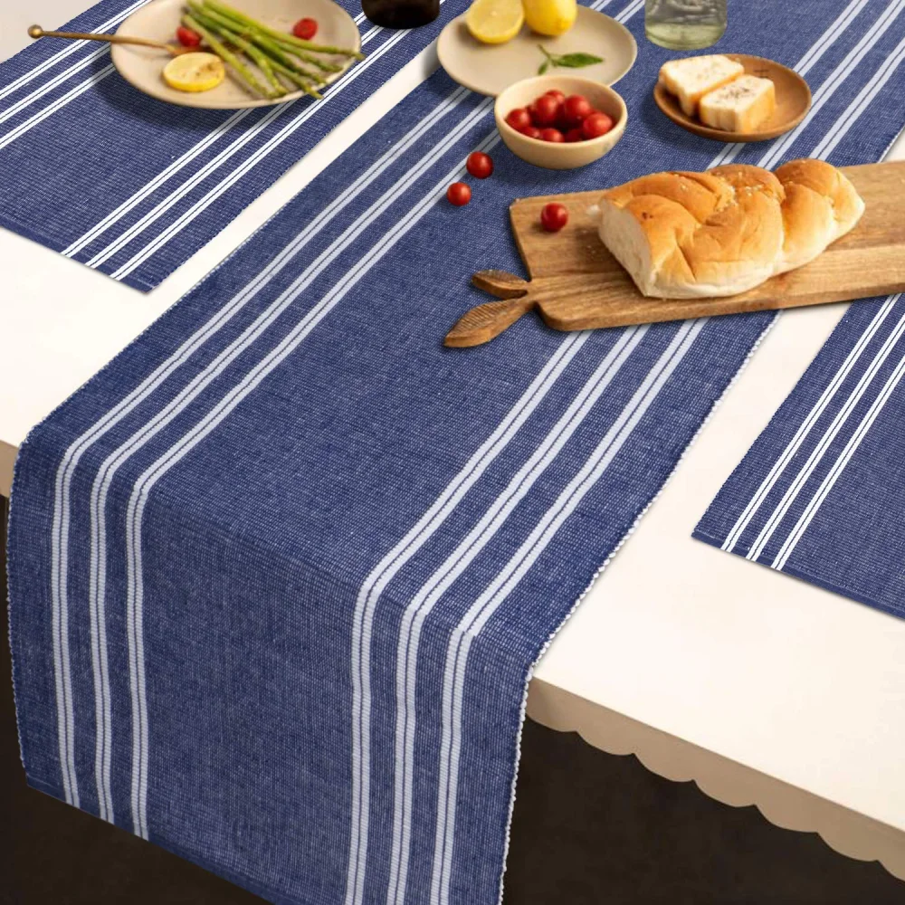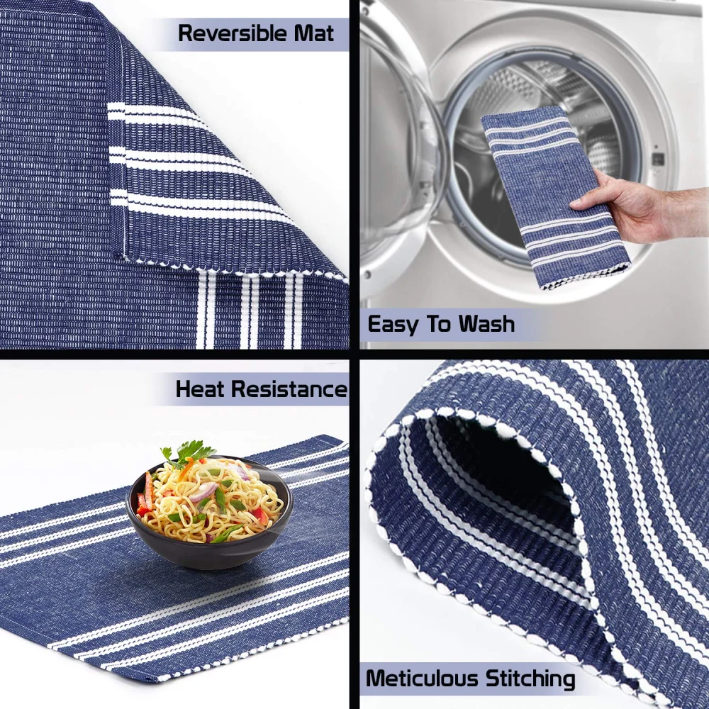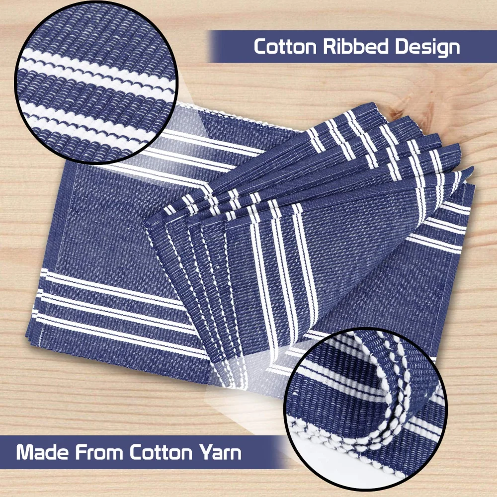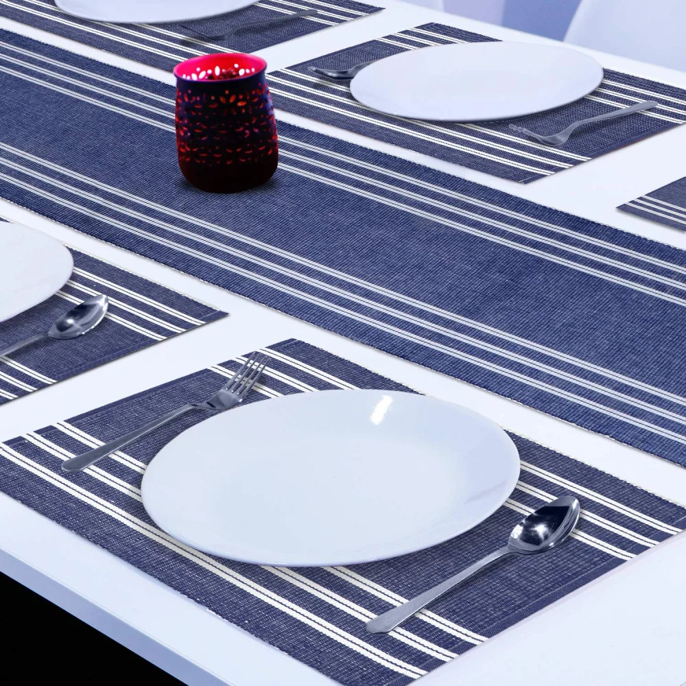 Cotton Ribbed Washable 6 Table Mats with Runner, Blue