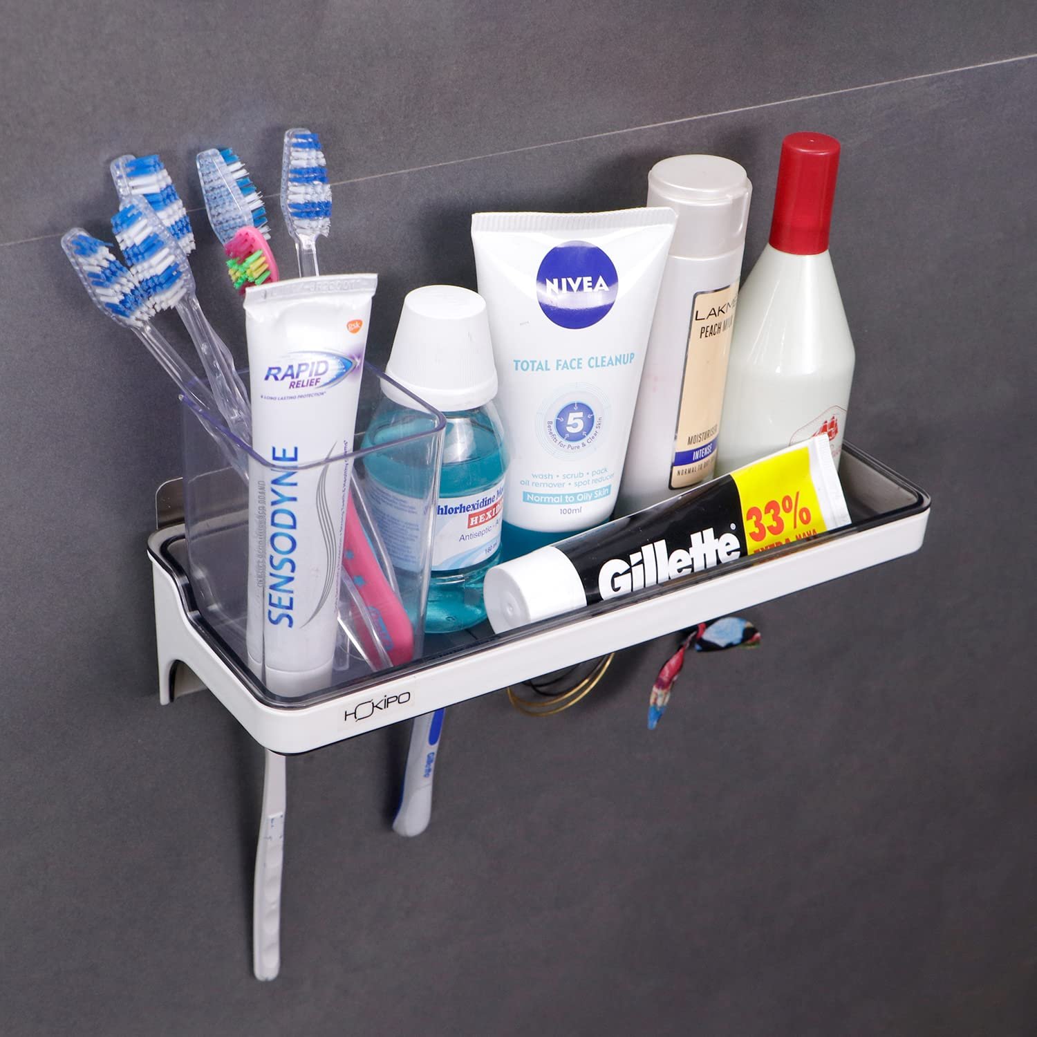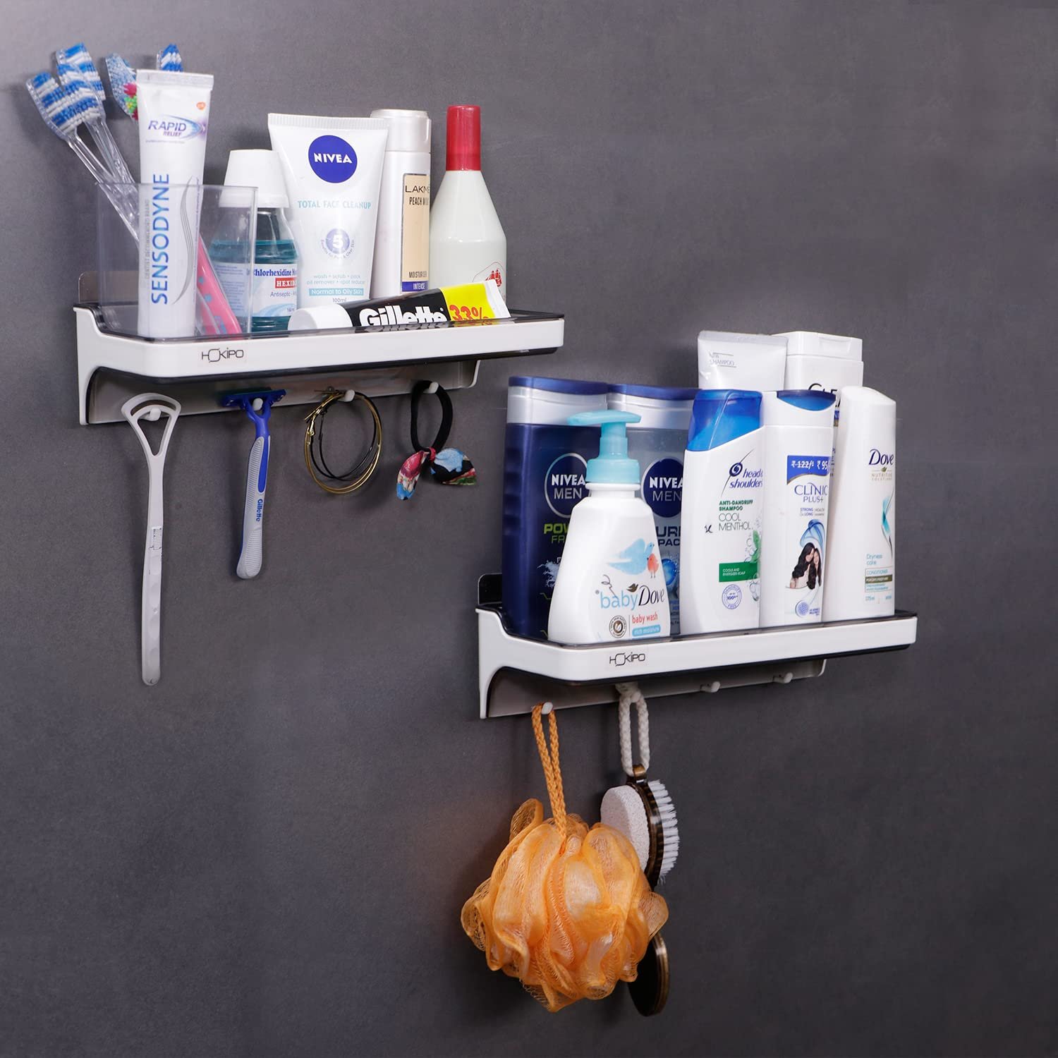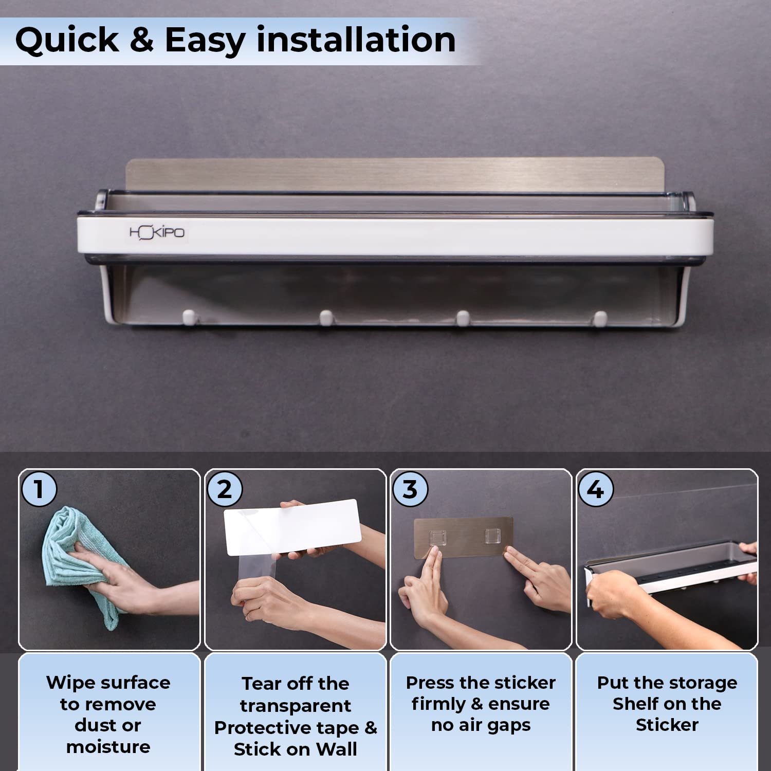 • Self Adhesive Bathroom Shelf Organizer comes with super strong Magic Sticker. DIY quick installation in a minute. Our bathroom organizers comes with strong self adhesive magic sticker. No extra tool or hardware required for installation