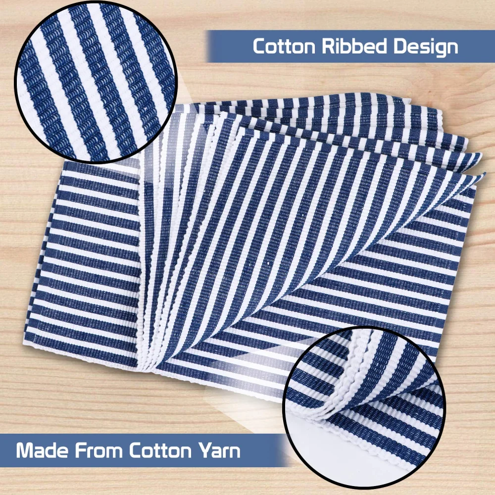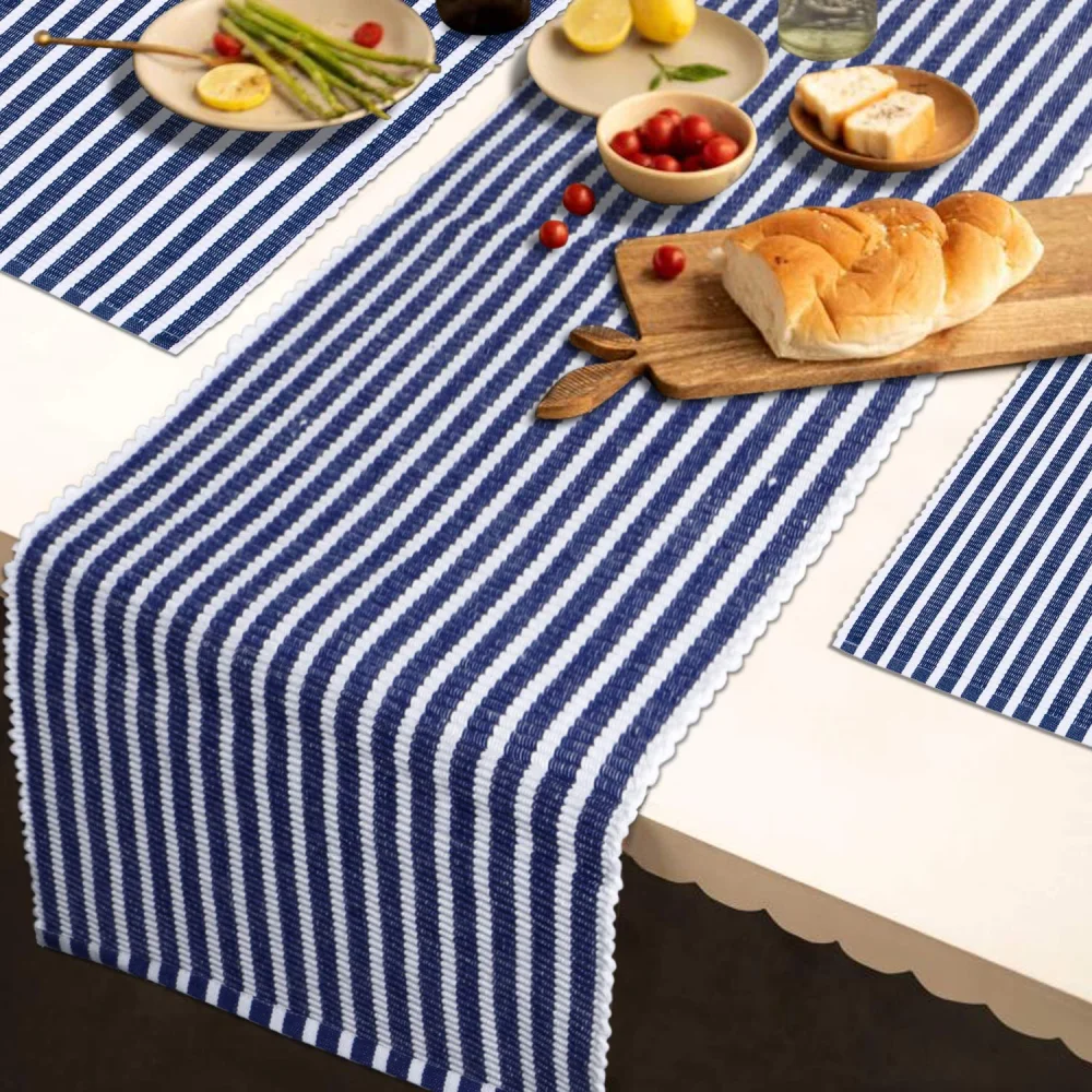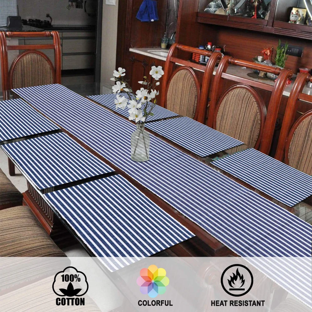 New Cotton Ribbed Washable 6 Table Mats with Runner, Stripped Blue