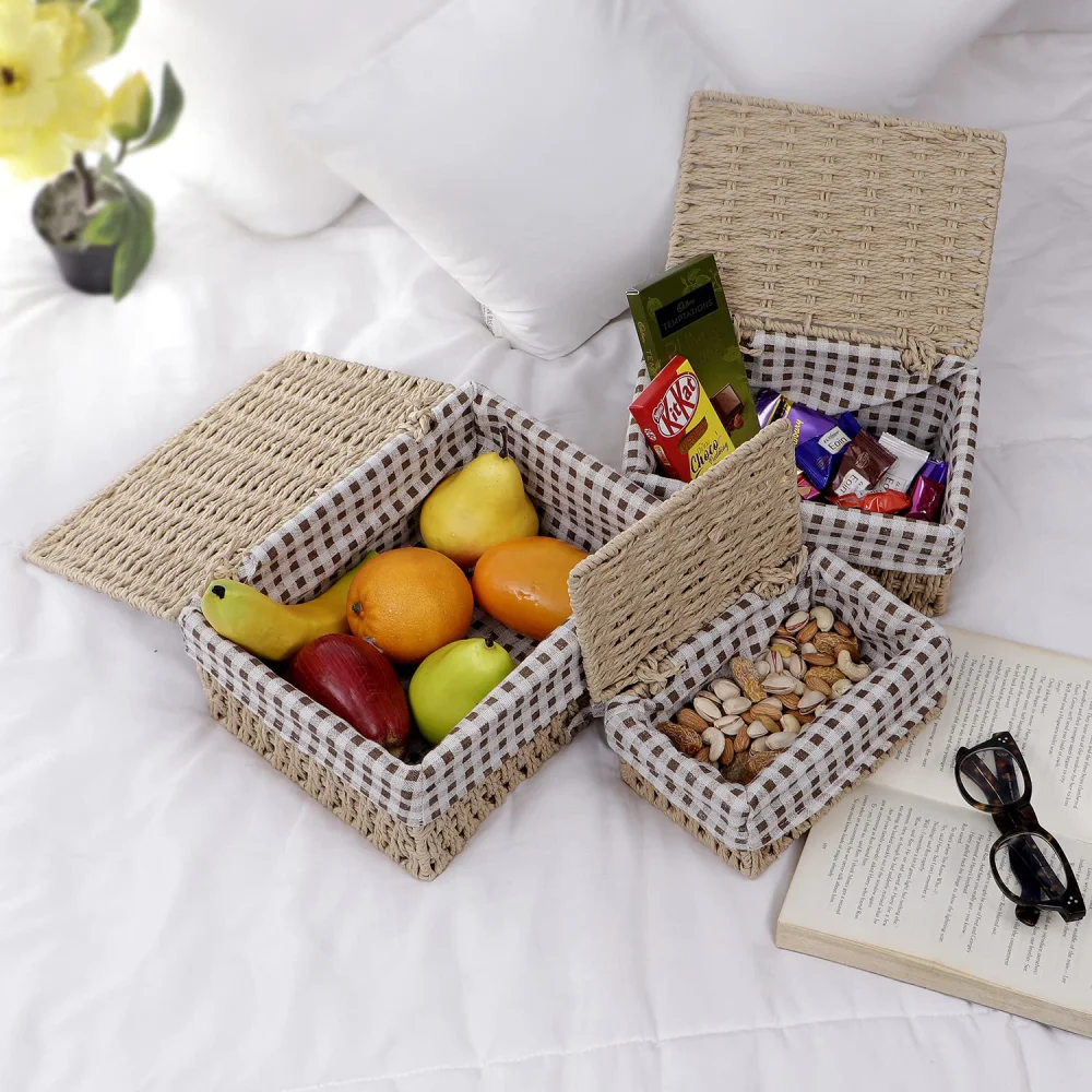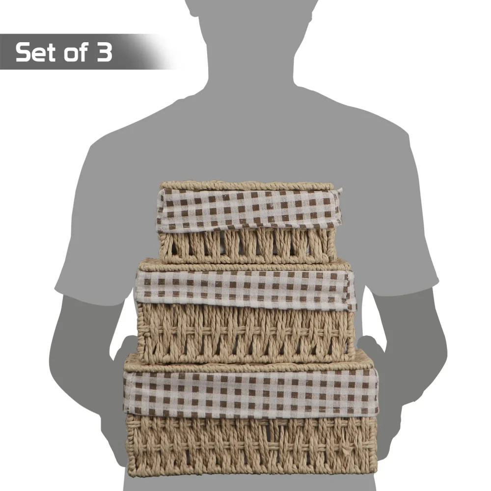 - Package contains pack of 3 handwoven paper weave baskets with lid. Dimensions: Large: 11x21x26 cm, Medium: 10x15x22 cm, Small: 8x12x18 cm.
