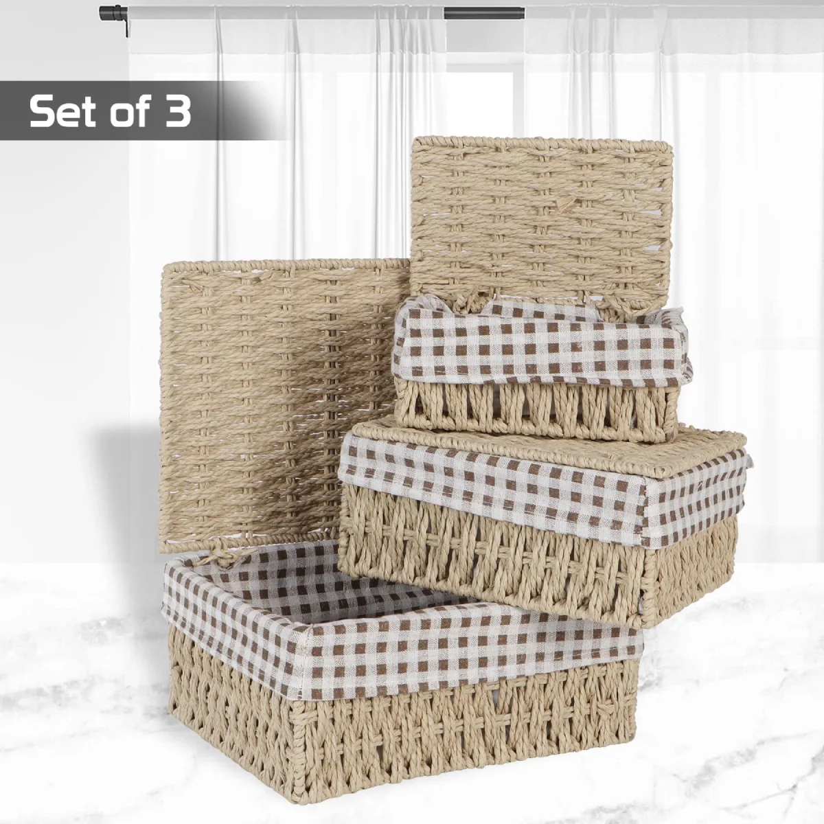 New Eco-Friendly Paper Rope Wicker Storage Baskets with Lid, Pack of 3, Beige
